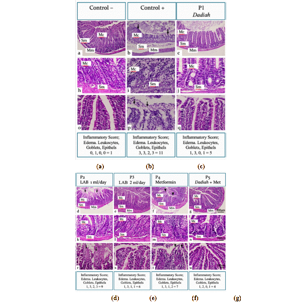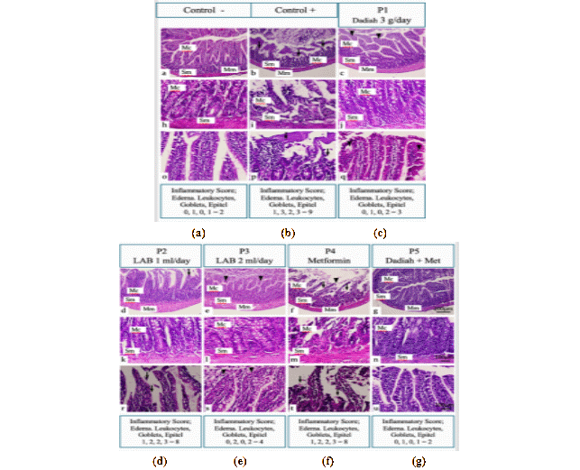 Figure 3 shows the histological picture of the large intestine of rats in various treatment groups. The structure of the tissue in the large intestine changed with each treatment. To see this, look at groups C− (negative control) and C+ (positive control) with Dadiah (c), low-dose BAL (d), high-dose BAL (e, l, s), metformin (f, m, t), and metformin and Dadiah together (g, n, u).