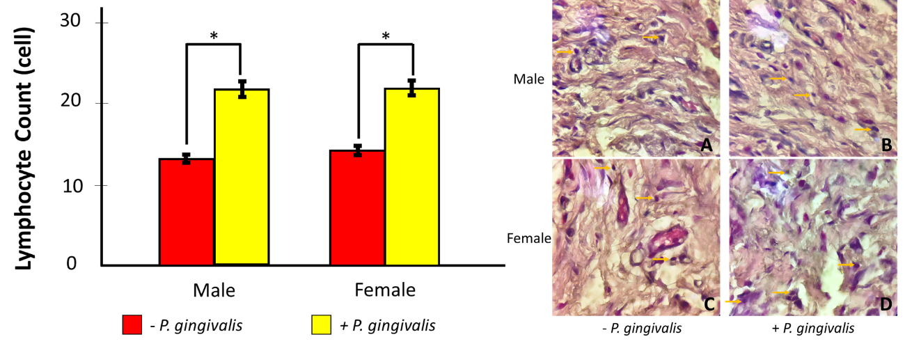 Figure 4 Number of lymphocytes in the gingival tissue of male and female rats at day 19. The figure presented the mean and standard error values; * indicated a significant difference analyzed Independent T-Test (p < 0.05); A, male rats without P. gingivalis injection; B, male rats with P. gingivalis injection; C, female rats without P. gingivalis injection; D, female rats with P. gingivalis injection; yellow arrows, lymphocytes in the gingival tissue.
