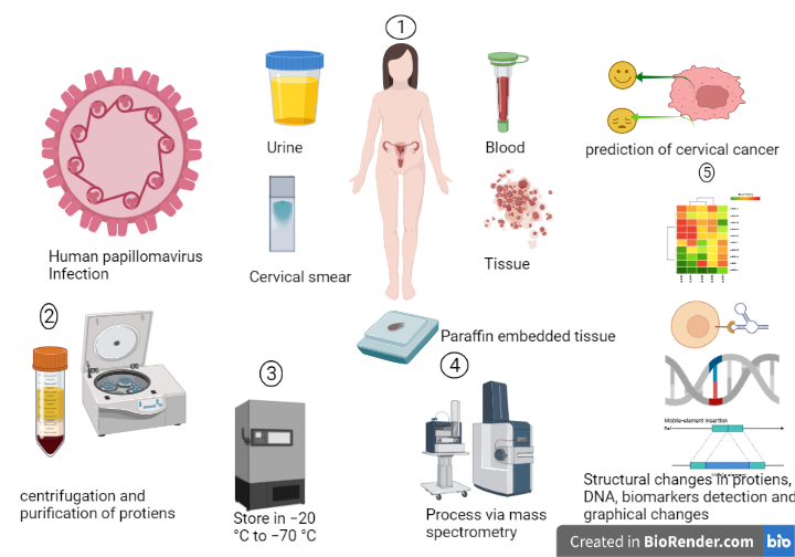 Biomarkers for cervical cancer diagnosis and progression prediction are found using a variety of methods. Although tumor biology has long been the accepted approach, new technologies like next-generation sequencing (NGS) and mass spectrometry (MS) have made it possible to find biomarkers in bodily fluids [16]. Potential biomarkers must go through crucial stages like identification, validation, and verification before they may be used in clinical settings. Thorough evaluation is necessary to guarantee analytical precision, scientific dependability, and practical utility while performing novel biomarker tests. It is anticipated that the discovery of cervical cancer biomarkers would greatly boost preventative and treatment approaches. The function of biomarkers in carcinogenesis, precancerous lesion diagnosis, and cervical cancer care has been emphasized in a number of research and reviews.