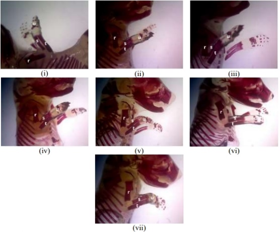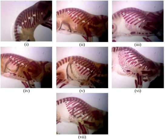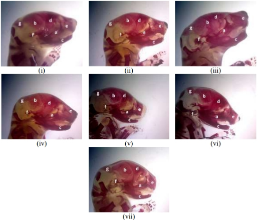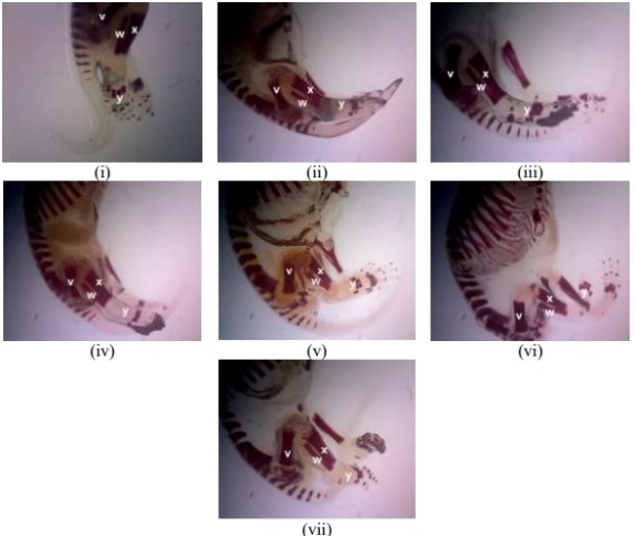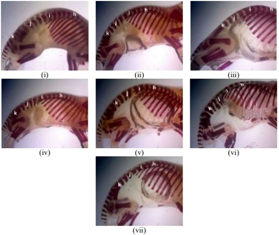 The fetuses obtained were weighed individually and measured from caput to caudal length. The fetuses were then divided into 2 groups for observation, namely the bone observation group and the organ observation group. The ossification fetus group was first put into absolute ethanol for 2 days. Absolute ethanol was replaced every 24 h. Then, after the fetus began to look transparent, it was stained with alizarin red S dye for 10 min. After that, it was rinsed using 1 % KOH. Then remove the remaining alizarin red S dye, soaking with a solution of KOH: Glycerin in levels of 3:1, 1:1 and 1:3. After completion, the fetus was observed using a light microscope to see malformations in the bones. Groups of organ fetuses were directly sliced at the caput with a transverse cut. Then the fetus was rinsed with 0.9 % NaCl. After rinsing, the fetus organs were observed with a stereo microscope to see any organ malformations. Then random sampling of fetuses from each treatment group of the test preparation was done in as many as 4 fetuses.