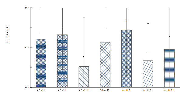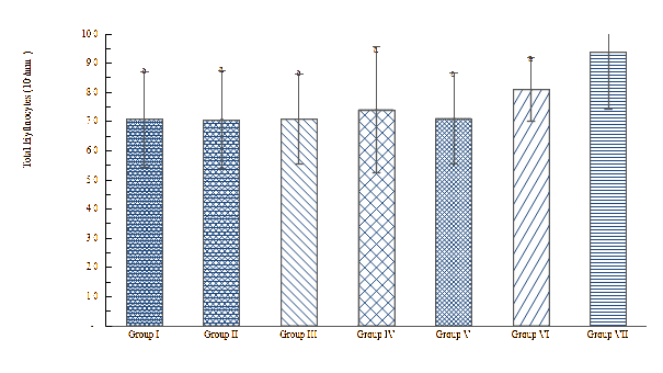 The results presented in Table 1 indicate that the average neutrophil percentage across all treatment groups remained within the normal range of 24.5 to 39.75 %, consistent with the reference range of 10 to 40 % [31]. One-way ANOVA analysis showed no significant differences among the groups (p > 0.05), suggesting that the ethanol extract of unripe Pisang Kayu has no significant impact on neutrophil percentage in M. musculus. Neutrophils are the initial type of leukocytes that react to acute inflammation by engaging in phagocytosis and eliminating microorganisms. They utilize free radicals, including superoxide and hydrogen peroxide, along with various inflammatory mediators to perform this function. Although flavonoids in the extract are believed to influence neutrophil levels, the study found no inflammatory effects, as evidenced by the lack of increased neutrophil levels in any treatment group [36]. Similarly, the lymphocyte percentage across all groups ranged from 57.2 to 70.5 %, within the normal range of 55 to 95 % [31]. The 1-way ANOVA results (p > 0.05) confirmed that the extract did not significantly alter lymphocyte percentages. Lymphocytes, key players in the humoral, cellular and cytotoxic immune responses, interact with antigens in the body, with T cells providing cellular immunity and B cells producing antibodies for humoral immunity [37]. Fluctuations in lymphocyte levels may indicate viral or bacterial infections, metabolic diseases or chronic inflammatory conditions, but no such effects were observed in this study.