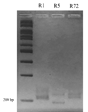 Figure S2 The PCR amplification results with SSRY13 primer show that the PCR product of R1 has 1 fragment, whereas R5 and R72 exhibit two fragments.