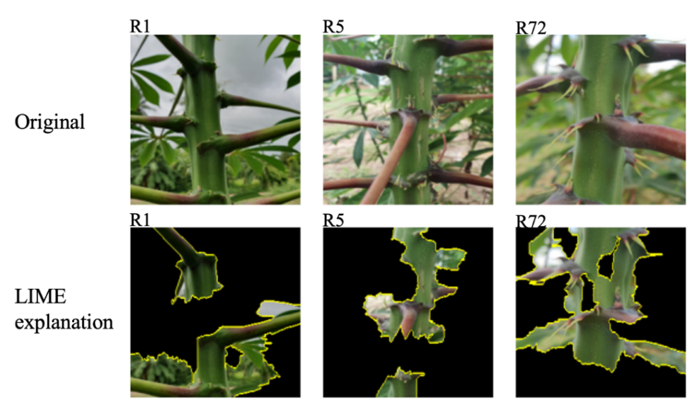 In the evaluation step, after selecting the best-performing fine-tuned model from the 4 pretrained models, we investigated the model decision-making process and its relation to the previous idea of using morphometric analysis. To achieve this, the local interpretable model-agnostic explanations (LIME) technique was employed to generate interpretable explanations for individual predictions made by the chosen model [22]. The LIME method aims to explain the predicted outcome of a hybrid-cassava image by sampling the images and then generating variants of the image by dividing the image into connected pixels with similar colors. By sorting them, we obtain the parts of the image (superpixels) that have the highest probability for a label. The interpretation of this superpixel image is the part of the (full) image that contributes the most to the prediction.