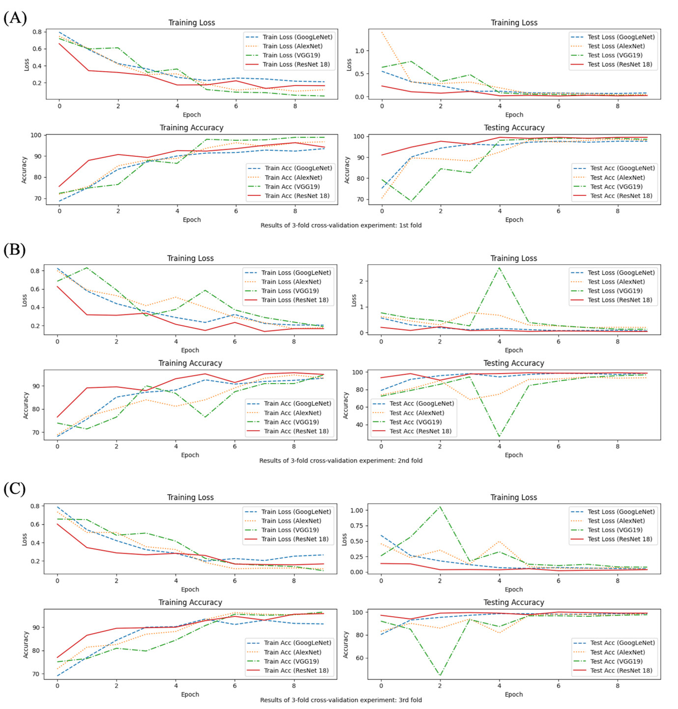 Figure S4 Accuracy and loss for training and testing ResNet-18 with 3 replications (A) - (C) were evaluated.