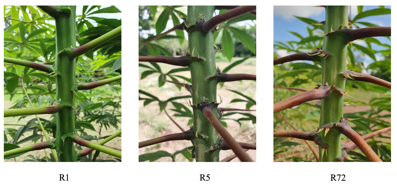 Figure 2 Cassava cultivars cv R1, cv R5, and cv R72 used in this field study.