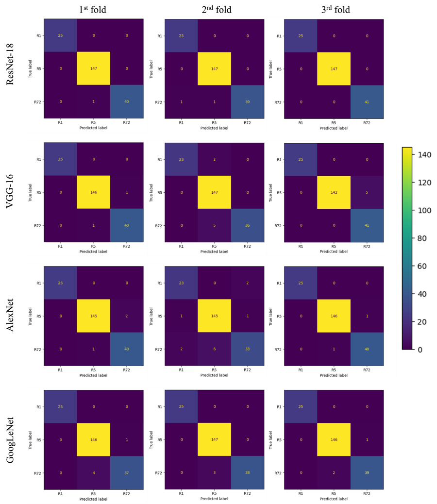 The stem region in the cassava images was used to assess the efficacy of the deep neural networks. Principal component analysis (PCA) outcomes were employed to determine the selection of suitable candidate pictures for subsequent machine learning analyses. The 644 images were divided into training and testing datasets as follows: Cv R1 (49 for training and 25 for testing), cv R5 (297 for training and 147 for testing), and cv R72 (85 for training and 41 for testing). The original image size was adjusted to 256x256 pixels, and the region selected for study was cropped to 224x224 pixels to exclude the background. Four convolution network architectures were compared including ResNet-18, VGG-16, AlexNet, and GoogLeNet. The accuracy and categorical cross-entropy loss were utilized to evaluate the performance of these models. Each experiment was conducted for a total of 10 epochs. The choice of 10 epochs was based on empirical observation of the training process. The model showed rapid convergence, reaching near-zero training error in the early epochs, indicating that additional training epochs were unnecessary. Following the fine-tuning process, all models achieved an accuracy surpassing 95 % on the pretrained dataset, except for AlexNet in the 2nd fold. ResNet-18 showed the highest percentage of accuracy across all 3 partitions. ResNet-18 was selected for discriminating hybrid cassava because it demonstrated the highest accuracy among the 4 models of 100 % at the 3rd fold. The performances of the 4 models were evaluated for accuracy and the estimated training and testing loss (Table 2). Both the training and testing loss values indicated that the models performed well during both the training and testing phases. The values of training and testing losses remained consistently proximate across all architectures, with a slight increase in testing loss toward the end (Supplementary Figure S4). A confusion matrix was constructed to facilitate a comparative analysis between the predictions and the actual classifications established by the 4 models. As depicted in Table 2, the 4 fine-tuning techniques successfully discriminated among the 3 cassava culture varieties. ResNet-18 achieved the highest accuracy across all 3 folds. However, certain misclassifications were detected within the ResNet-18 results. During both the 1st and 2nd folds, cv R72 was inaccurately classified as cv R5, while within the 2nd fold cv R72 was misidentified as cv R1.