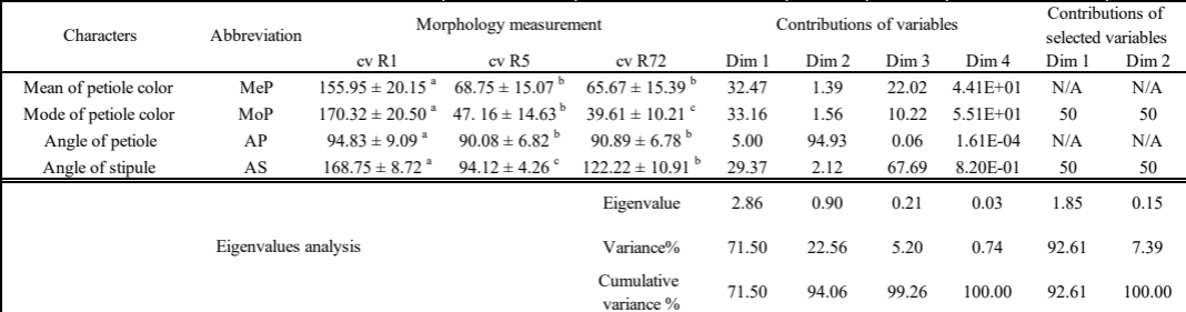 Values of morphology measurements are mean ± standard deviation for the 3 cultured varieties of cassava (N = 45). The same lowercase letter within a row indicates no significant statistical difference at p < 0.05 according to the ANOVA test. Eigenvalue analyses were tested for the total amount of variance that could be explained by a given dimension.