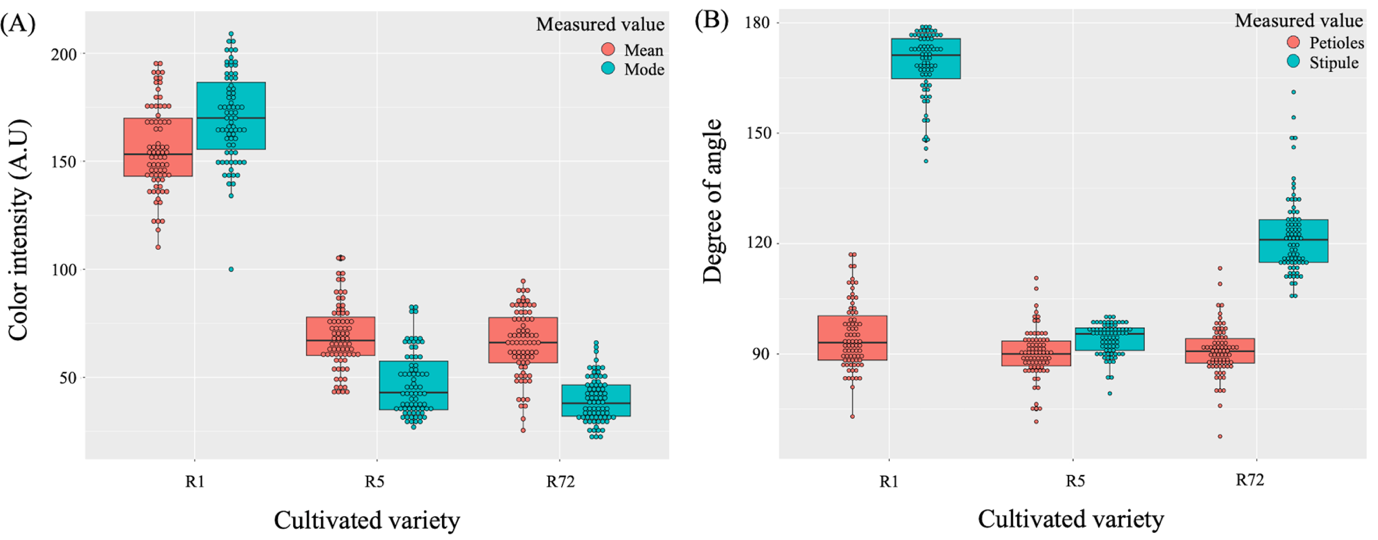 The plant organ pictures were analyzed using ImageJ software (version 1.48c, Wayne Rasband, NIH, Bethesda, MD, USA). Color expressions of the cassava leaves and stems were measured using the histogram order function, while the degree angles of petioles and leaf apices were measured using the angle tool in ImageJ (Supplementary Figure S1). The mean ± standard error values were calculated based on the ImageJ measurements. One-way analysis of variance was used to assess the variability in plant characteristics and the multiple comparison was tested by the Fisher LSD method at significance level 0.05 using Minitab (version 21.4.3, USA). Descriptive statistics were gathered for leaves and stems, and the outcomes were visualized through bar graphs with dot plots. Statistical assumptions were checked for normal distribution and equal variances were assumed for the analysis. Principal component analysis (PCA) was conducted on a dataset exhibiting linear correlations among variables to facilitate the identification of distinct characteristics of the 3 cassava cultivars.