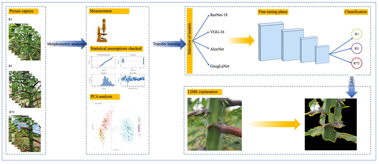 Figure 1 illustrates the workflow for hybrid cassava identification, encompassing morphometric analysis, transfer learning, and interpretability using LIME. The process begins with image capture from 3 cassava varieties (where cv R72 is a hybrid of cv R1 and cv R5). These images undergo morphometric analysis, including the measurement of relevant traits using the ImageJ program, statistical assumption checks and PCA for visualization of data distribution. In the transfer learning phase, several pre-trained deep learning models, including ResNet-18, VGG-16, AlexNet, and GoogLeNet, are evaluated. The selected model is then fine-tuned to optimize classification performance across the 3 categories (R1, R5, R72). Finally, interpretability is achieved using LIME. LIME provides visual explanations by highlighting the image regions that contribute most to the classification, enhancing the transparency of model predictions and fostering user trust in the analysis pipeline.