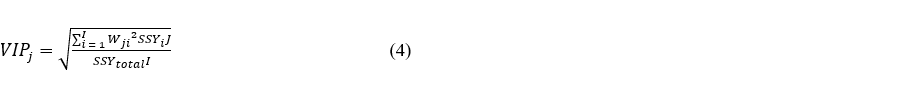 First, the VIP score was calculated for each wavelength to consider the selection in Eq. (4). Then, to extract the effective variables, wavelengths with a VIP score of < 1.0 were excluded and regarded as a variable with a low contribution [13-47]. The strategy of choosing the threshold followed that of the previous study [47]. Our study found that the VIP method reduced the number of wavelengths in Vis/NIR (69.70 to 73.19 % reduction) and SWNIR (59.17 to 66.67 % reduction). Second, decision parameters for selecting effective wavebands using the bPLS method were based on the RMSE for every trial and error from the combined wavelengths. In bPLS, this algorithm could reduce the number of Vis/NIR variables by 98.65 %. Meanwhile, the effectiveness of bPLS and VIP slightly differed, producing a 66.67 % reduction when using SWNIR spectra.