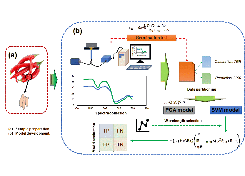 To date, the application of spectroscopic methods for seed viability discrimination, as aforementioned, remains limited. One possibility is that internal quality improvements, such as those achieved through genetic engineering, have been implemented to increase viability rates, as cited elsewhere [25]. Notably, although genetic engineering could improve the crop’s productivity and increase the germination rate [26], it remains controversial in several countries and among certain belief systems [27]. Furthermore, despite the high accuracy of FT-NIR and Raman spectroscopy [28], they are relatively more costly in practice than Vis/NIR or shortwave near-infrared (SWNIR) spectroscopy. Thus, this study used modular Vis/NIR spectroscopy, comprising two spectra in a single measurement, i.e., Vis/NIR (400 - 1000 nm) and SWNIR (1000 - 1700 nm), with the purpose as follows: 1) Investigate the feasibility of Vis/NIR and SWNIR spectroscopy to discriminate CP seed based on its viability and 2) Develop a non-destructive model of CP viability test using Vis/NIR and SWNIR spectroscopy by the SVM method through the whole and selected spectrum. This study used 3 common CP seed varieties, namely Capsicum annum var. Grossum, Capsicum annuum L. var. Longum, and Capsicum frutescens L. will be involved. Furthermore, our main goal is to develop one general model such that the spectra from these varieties will be mixed and examined.