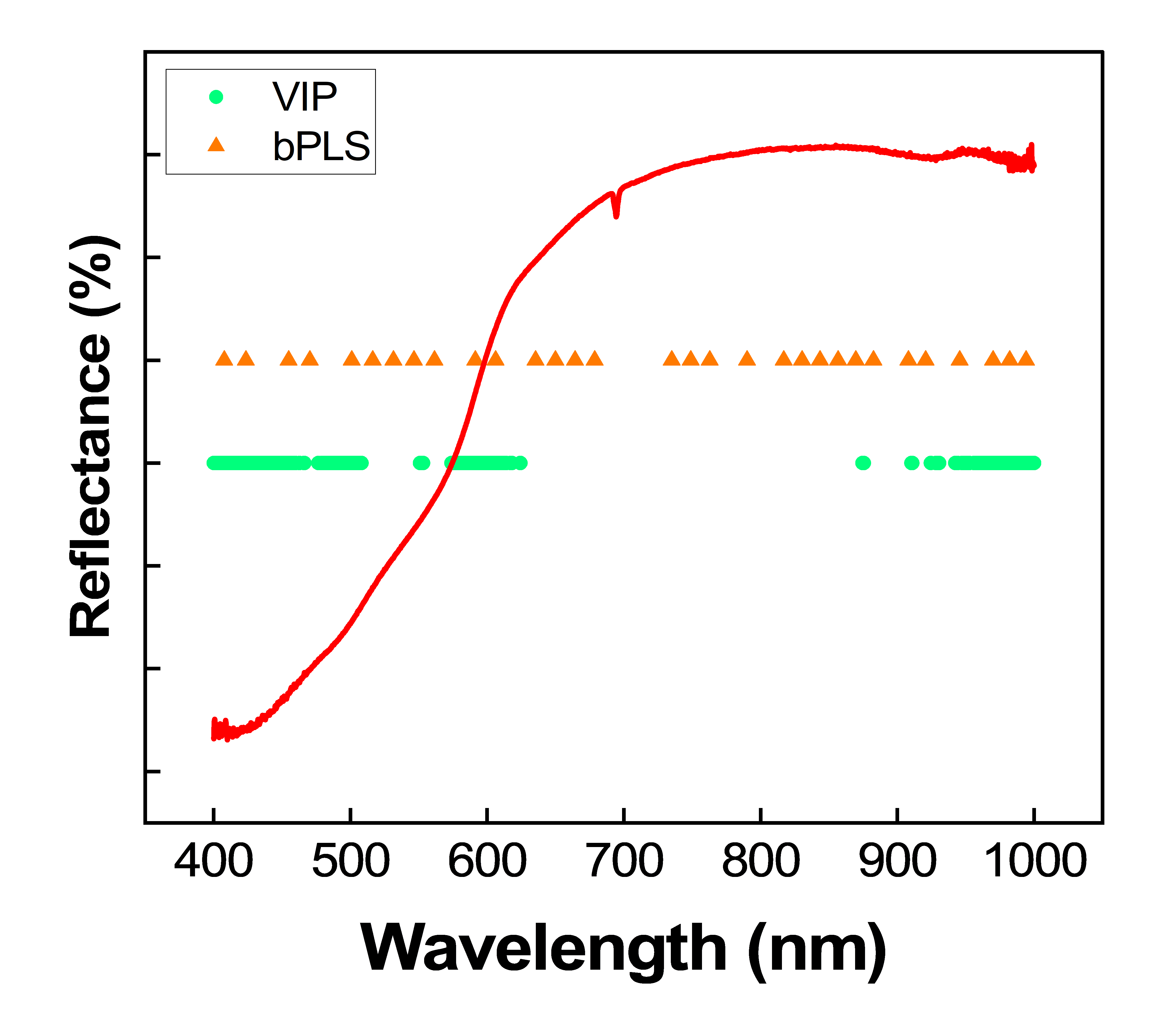 Figure 7 Representation of full Vis/NIR spectrum (red line) and selected wavelengths using VIP and bPLS algorithms (shown in circle and triangle plots).
