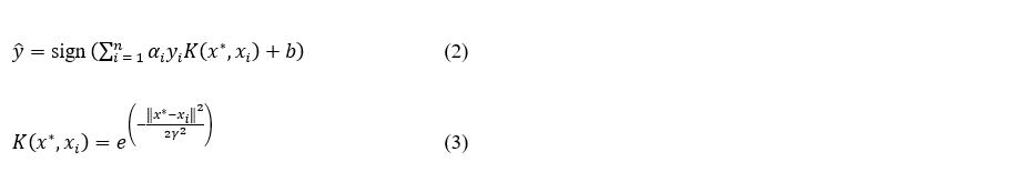 The SVM is essential in optimizing the minimum distance of the hyperplane to the closest training sample [30]. This current study applied nonlinear SVM, the extended aim of the linear SVM. The Gaussian or radial basis function (RBF) kernel with the SVM method was implemented to address this issue. Furthermore, the RBF kernel enables the maximum-margin-separation hyperplane among linear and polynomial kernels to distinguish viable and inviable classes (Figure 2) [31]. This kernel function maps the original spectra dataset into high-dimensional space to easily classify the CP seed viability. The mathematical computation of SVM is expressed in Eqs. (2) and (3).