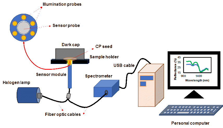 Yet, it is nearly impossible for farmers to assess the CP viability through their naked eyes. Several measurements are used to test seed viability. For instance, the viability of Jatropha curcas L. was confirmed by sowing the seed in the sand and performing a tetrazolium chloride (TTZ) test [6]. Likewise, this method was also carried out to check the viability of barley [7] and papaya seeds [8]. Nevertheless, as the current germination test method is time-consuming and inefficient, the seed could die during measurement before obtaining the results [3]. Moreover, this method produces chemical waste and requires skilled operators. Thus, an alternative method, i.e., non-destructive measurement, is necessary to replace the common-conventional method. Therefore, this study will evaluate a non-destructive method, implementing a spectroscopic technique. The spectroscopy method is used to overcome the limitations of the conventional methods since it offers rapid, less sample preparation, and non-destructive measurement.