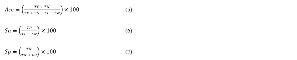 The performance of the SVM classifier for its ability to detect viable and inviable CP seeds was evaluated by calculating the percentage of accuracy, sensitivity, and specificity [34]. These evaluation metrics were computed for both results in the calibration and prediction groups. Mathematically, the evaluation metrics can be formulated in Eq. (5) - (7), respectively.