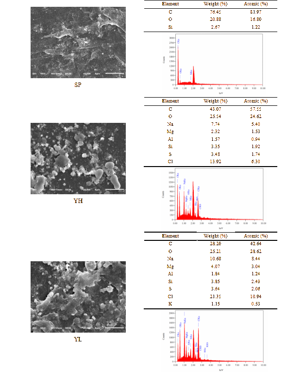 Figure 1 SEM-EDX microscopy of plastic waste. JH: Marunda-Jakarta-HDPE; JL: Marunda-Jakarta-LDPE; JP: Marunda-Jakarta-PP; SH: Cipta-Semarang-HDPE; SL: Cipta-Semarang-LDPE; SP: Cipta-Semarang-PP; YH: Baros-Yogyakarta-HDPE; YL: Baros-Yogyakarta-LDPE; YP: Baros-Yogyakarta-PP.