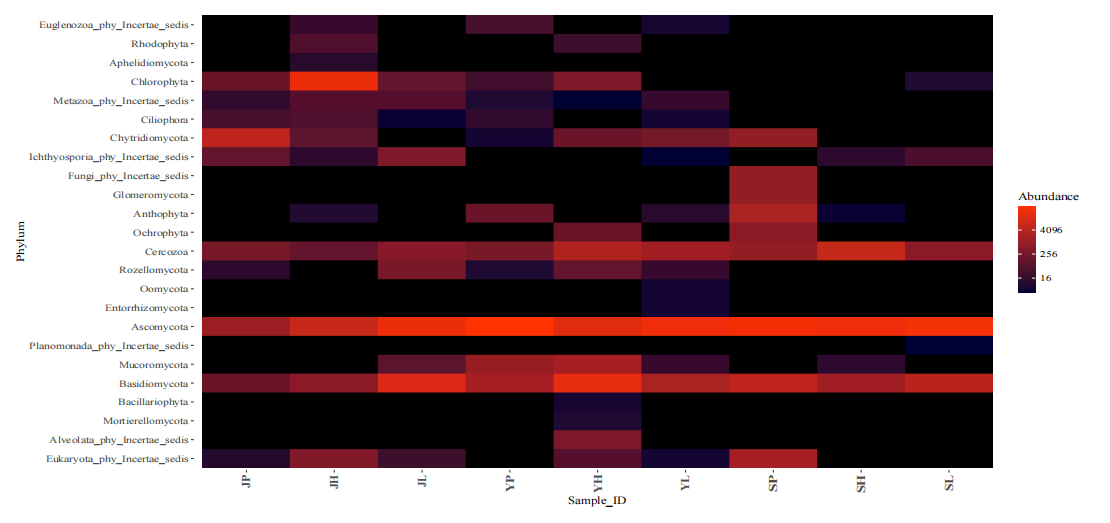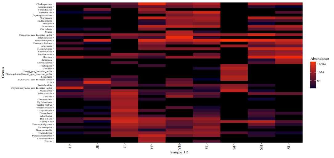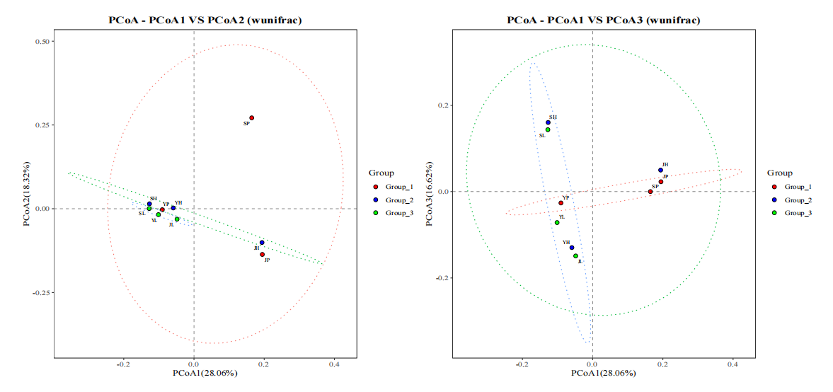 A multivariate statistical method called principal component analysis, or PCA, aids in visualizing the distribution patterns and genetic relationships of the recovered sequences. The fungal communities in the plastisphere, clustered along the 1st (28.06 %) and 2nd principal coordinates (16.62 %). As shown in Figure 4, according to the PCoA scatter plot there are 3 distinct groups. The same locations tend to cluster in 1 group, i.e SH-SL, JH-JP, YP-YL. This shows that the same environmental conditions tend to affect the diversity of plastisphere fungi more than the type of plastic. Plastic types can provide a substrate for fungi to thrive, but their presence is outweighed by the influence of wider environmental factors. For example, although some fungi can utilize plastics as a carbon source, their existence remains dependent on favorable environmental conditions. The results of this study are in line with previous research that shows the type of plastic does not affect the composition of plastisphere fungi [58]. SP, JL, YH samples which do not cluster according to location can be related several ecological, methodological, and environmental factors. The ecological variability i.e. species composition and microhabitat differences. SP, JL, and YH samples may composed different species compositions that are not influenced by their geographical proximity. Even within the same geographical area, microhabitat can be vary significantly.
