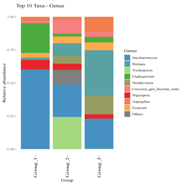 Furthermore, Saccharomyces (60.03 %), Cladosporium (22.39 %), and Nigrospora (7.33 %) are dominant genera in group 1. The 3 superior genera of group 2 are Saccharomyces (24.53 %), Trichosporon (24.36 %), and Cercozoa (10.38 %). Additionally, Hortaea (34.02 %), Saccharomyces (22.65 %), and Neodevriesia (14.44 %) were superior genera in group 3 in this study. This result not in line with previous studies examine Fusarium mainly on plastic’s surface [47]. This is different from previous research, which shows Gibberella (12 %), Trichosporon (3.1 %), and Paraphoma (2.8 %) were dominant [48]. Alternaria being specifically enriched in the soil plastisphere [49]. Moreover, other research showed that fungal genera from the plastisphere i.e. Aspergillus [50], Penicillium, Peacilomyces, Absidia, and Cochliobolus [51], Trichoderma, Monascus, Clitocybe, and Phanerochaete [52] demonstrated plastic-degrading ability.