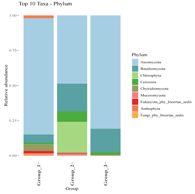 Metagenomic data analysis, in addition to each sample, was also grouped by plastic type. Groups 1, 2, and 3 are HDPE, LDPE, and PP plastics. Figure 2 represents the top 10 phylum and genus of the 3 groups. For phylum level, relative abundance of group 1 are Ascomycota (83.01 %), Basidiomycota (5.90 %), and Chytridomycota (4.68 %). Relative abundance for group 2 are Ascomycota (48.74 %), Chlorophyta (22.13 %), and Basidiomycota (19.82 %). Moreover, Ascomycota (80.92 %), Basidiomycota (16.80 %), and Cercozoa (1.90 %) are dominant for group 3. This result is in line with previous studies that find Ascomycota, Basidiomycota, Chytridiomycota, and Mucoromycota were dominant in the terrestrial-marine ecotone [41]. The Ascomycota, Basidiomycota, and Chytridiomycota phyla on biodegradable plastics and foamed polystyrene substitutes submerged in a marina [42]. Ascomycota dominant in the plastisphere even in extreme weather conditions [43]. Chytridiomycota and Cryptomycota species were found in freshwater plastisphere [44]. Both for the 3 group, Ascomycota was superior, as was the same with other studies that Ascomycota was the majority in the Alpine and Arctic terrestrial plastisphere [45] Ascomycota, Mortierellomycota, and Basidiomycota dominated in polyethylene (PE) and polybutylene adipate terephthalate/polylactide (PBAT/PLA) microplastics in farmland [46].