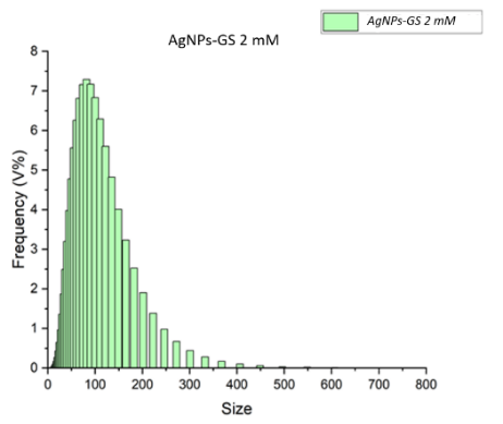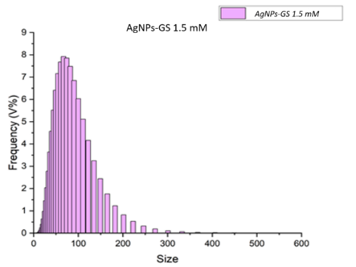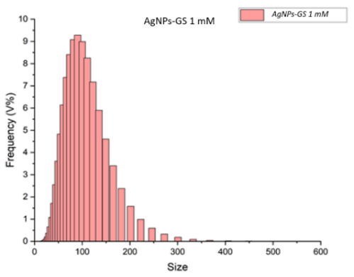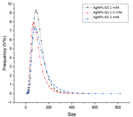 The Particle Size Analyzer (PSA) was used to measure the size distribution of nanometer-sized particles. The PSA results for Grape seed extract AgNPs at concentrations of 1, 1.5 and 2 mM were 118.36, 100.79 and 128.71 nm, respectively (Figure 3).