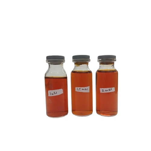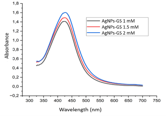 The synthesis of Piper scrotum silver nanoparticles (AgNPs-Gs) was performed using the green synthesis method based on modified procedures from previous studies [47,11]. Prior to synthesis, variations in the concentration of the AgNO3 solution were prepared by dissolving 0.0425 g of AgNO3 crystal powder for a 1 mM concentration, 0.064 g for a 1.5 mM concentration, and 0.085 g for a 2 mM concentration, each in 250 mL of distilled water. Then, 2 mL of grape seed extract was mixed with 18 mL of AgNO3 solution at varying concentrations (1, 1.5 and 2 mM) in an Erlenmeyer flask. The flask was covered with aluminum foil and placed in a microwave at 40 % of 900 W electrical power and a frequency of 2,450 MHz, with a synthesis time of 5 min. The synthesis of AgNPs-Gs was complete when the solution colour changed to yellowish-brown and became homogeneous. The AgNPs-Gs were then characterized using a UV-Vis spectrophotometer. The formation of silver nanoparticles was indicated by the colour change of the solution from clear to brownish-yellow [48].