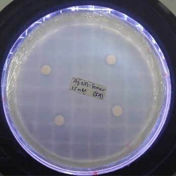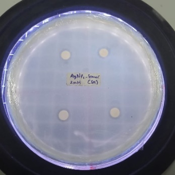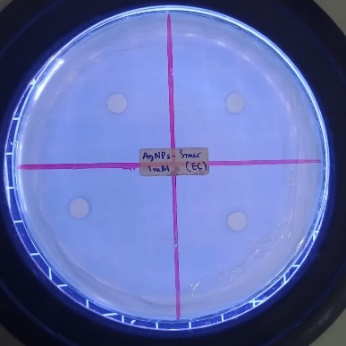 This test was conducted to determine whether the antibacterial compounds in silver nanoparticles synthesized with grape seed extract could increase the mortality of bacterial colonies. The disc diffusion (or cup) method was used to test antibacterial activity. A 50 μL bacterial culture sample was taken, and Tryptic Soy Agar (TSA) was added to a petri dish [50]. A paper disc was treated with 10 μL of grape seed extract. After the paper disc absorbed the solution, it was placed onto the surface of the agar medium in the petri dish. The petri dish was then incubated for 24 h. The presence of an inhibitory zone around the paper disc indicated the antibacterial activity of grape seed extract.