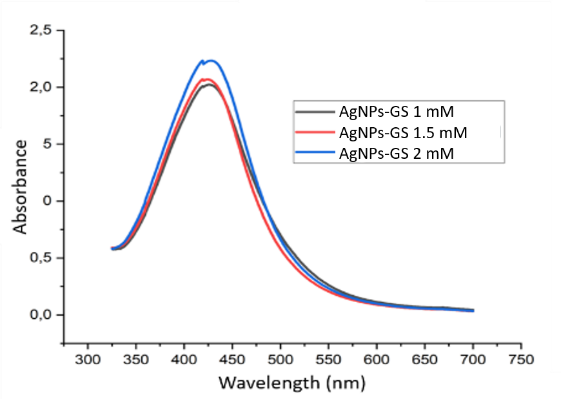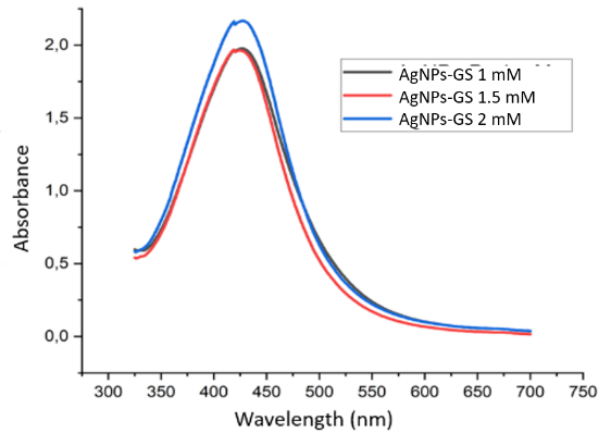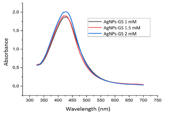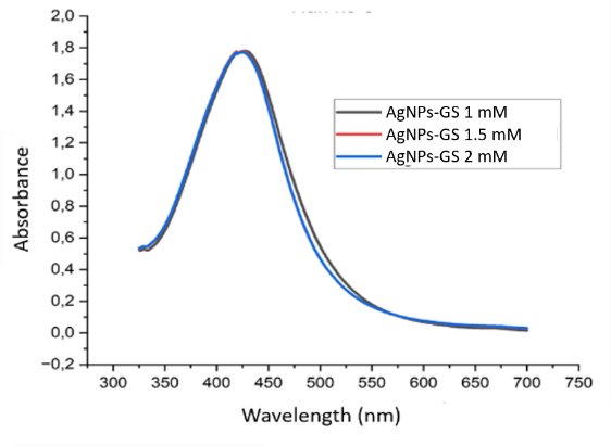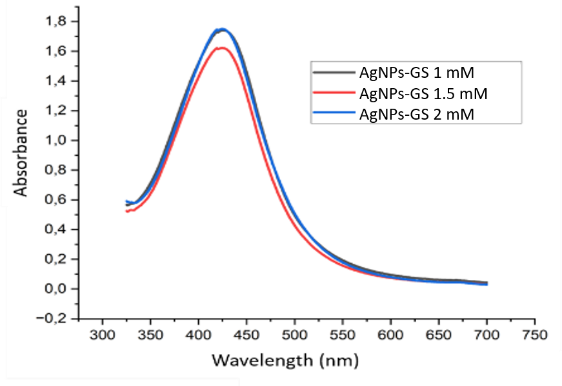 Figure 2 Absorbance spectrum of grape seed extract silver nanoparticles at concentrations of 1, 1.5 and 2 mM.