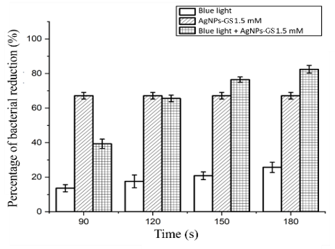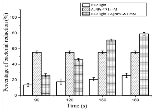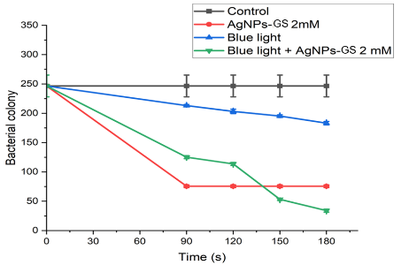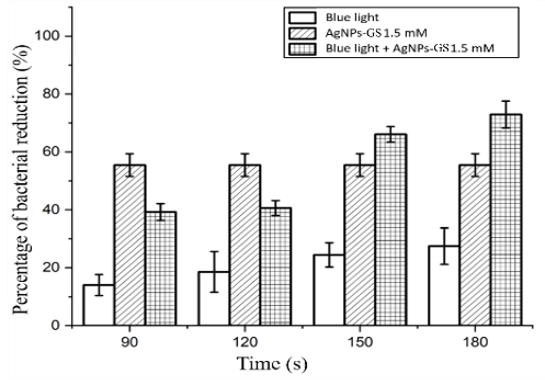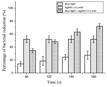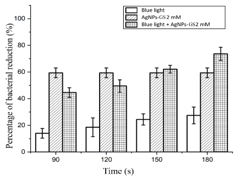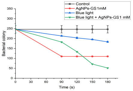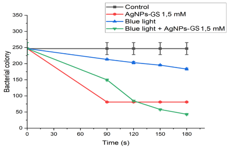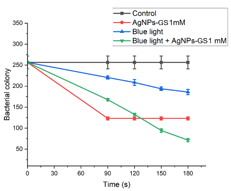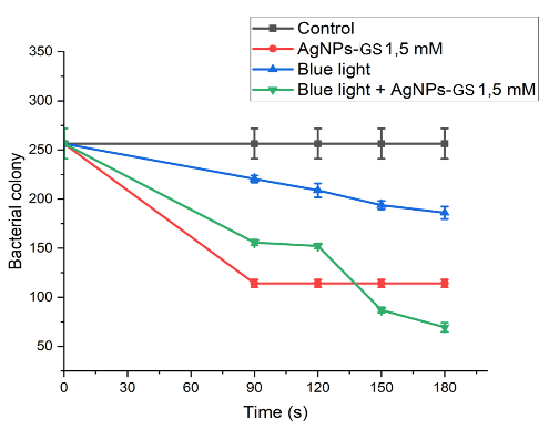 A laser is a light source that emits a coherent beam at a specific wavelength. A diode laser is a device capable of emitting coherent, focused and monochromatic photons. Several previous studies have demonstrated the efficacy of diode laser-based antimicrobial photodynamic therapy (aPDT) in inactivating bacteria and biofilms and accelerating wound healing [46]. The effectiveness of aPDT depends on the alignment of the light source’s spectrum with the absorption spectrum of the photosensitizer, as well as the intensity and energy of the exposed photons. This research aims to enhance the effectiveness of blue laser aPDT (405 nm) by incorporating grape seed extract silver nanoparticle photosensitizers (AgNPs-Gs) to reduce bacterial biofilms responsible for infections, including the gram-negative E. coli and gram-positive S. aureus.