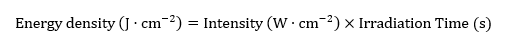 The light source used was a blue laser diode with a wavelength of 405 nm. Characterization was performed using a Jasco CT-10 monochromator to determine the peak wavelength. The power output was 2.49 MW, measured with an OMM-6810B-220V power meter. The spot beam area had a size of 0.13 cm2. Diode laser irradiation was carried out with varying exposure times of 90, 120, 150 and 180 s. The irradiation time was determined as follows to calculate the energy density [49].