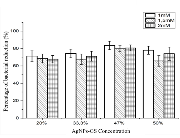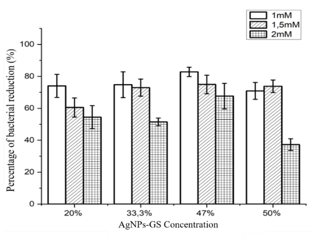The antibacterial activity of AgNPs-Gs was tested using the disk diffusion method, examining the inhibition zone in bacterial colony growth. The inhibition zone forms when AgNPs-Gs spread across the medium and kill or inhibit bacterial growth. The antibacterial test results against E. coli and S. aureus bacteria, as shown in Figure 5, reveal inhibition zones around the paper disc areas treated with AgNPs-Gs at 1, 1.5 and 2 mM. For E. coli, the inhibition zones measured 0.56, 0.84 and 0.92 mm, respectively. In the case of S. aureus, the inhibition zones were 1.34, 1.44 and 1.59 mm at concentrations of 1, 1.5 and 2 mM, respectively.