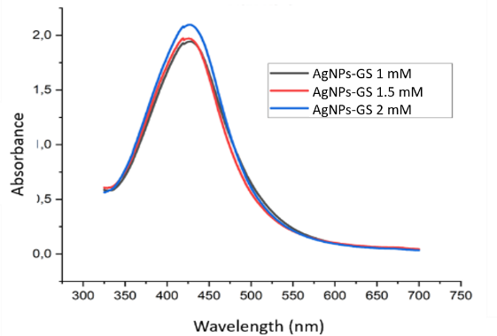 Characterization of the Grape seed extract silver nanoparticles (AgNPs) included 4 tests: UV-Vis, PSA, stability and FTIR. UV-Vis characterization was performed to evaluate the ability of Grape seed extract silver nanoparticles to absorb light at different wavelengths, ranging from 325 to 700 nm. The peak absorption spectrum of the Grape seed extract silver nanoparticles occurred at a wavelength of 425 nm, with an absorbance of approximately 1.7, as shown in Figure 2. Based on this absorbance value, the percentage of light absorbed by the photosensitizer during blue laser irradiation can be calculated using the Lambert-Beer equation, which yielded an absorption rate of 81.7 %.