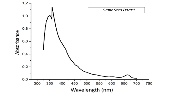 One plant that can be used for this purpose is grape seed. Grape seeds contain saponins, alkaloids and flavonoids [34]. The extract forms an orange precipitate, indicating the presence of flavonoid compounds, though in small amounts [35]. Flavonoids are a group of phenolic compounds with antioxidant properties, as they strongly tend to reduce metals [36]. The ability of phenolic compounds to chelate and reduce metals is attributed to the high nucleophilic character of the aromatic ring. The reduction of silver nanoparticles occurs through the oxidation of plant extract phenolic compounds [37]. Ag+ ions interact to form silver nanoparticles, which are stabilized by phenolic derivatives and other ligands found in plants [38]. Silver nanoparticles exhibit an intense absorption spectrum at wavelengths between 400 and 500 nm [39].