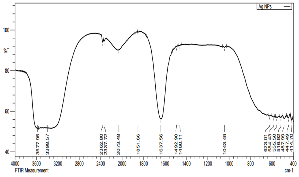 Based on Figure 4 and Table 2, the FTIR spectrum of AgNPs-Gs shows absorption peaks at 3,577.95, 3,398.57, 2,073.48, 1,637.56, 623.01, 584.43, 555.50, 516.92, 487.99 and 447.49 cm−1. These peaks indicate the presence of secondary metabolite compounds such as flavonoids, steroids, alkaloids and tannins in AgNPs-Gs, which act as reductants for silver ions and stabilizing agents. Flavonoids, which contain O-H groups, are identified by the hydroxyl groups in the reducing agents [52]. The FTIR results show an O-H group at 3,577.95 ccm−1, a characteristic feature of flavonoids. Also, alkaloids contain an O=C-N (amide carbonyl) group, observed at 1,637.56 cm−1. Thus, the FTIR characterization indicates that AgNPs-Gs contain secondary metabolites, specifically flavonoids and alkaloids, as reductants for silver metal ions.
