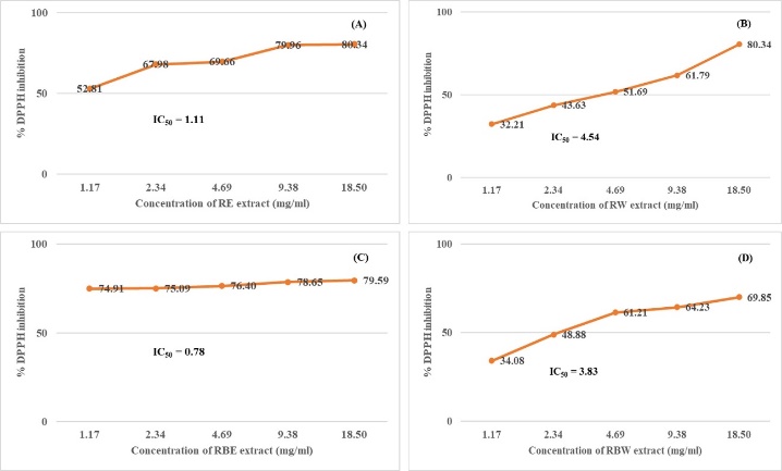 Antioxidant activity of RW, RE, RBW and RBE by DPPH assay