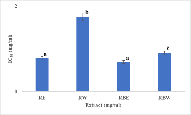 Figure 2 DPPH radical scavenging activity of Si Boo Gan Tang rice and rice bran extracts (RE, RW, RBE and RBW). The IC50 value are expressed as mg/mL. (RBE = Rice Bran Ethanol Extract, RBW = Rice Bran Aqueous Extract, RE = Rice Ethanol Extract and RW = Rice Aqueous Extract). Results are presented as mean ± standard deviation (n = 3). Indicates significant difference at p < 0.05.