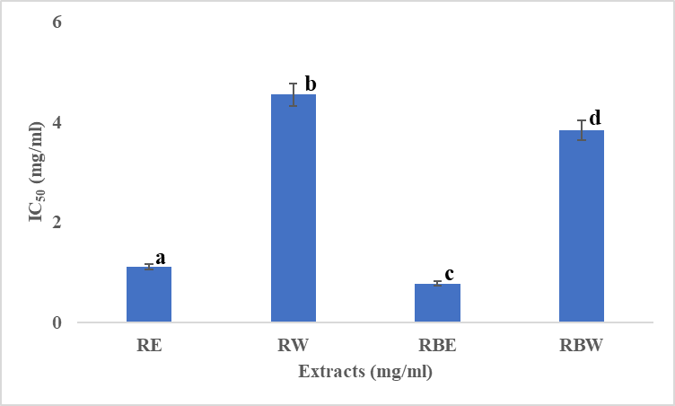 The total flavonoid concentration was determined using the Folin-Ciocalteu technique, with some modification based on a prior study conducted by [7]. A solution was made by combining 50 µl of a 5 % NaNO2 solution with 20 µl of RW, RE, RBW, and RBE extracts. After a comprehensive mixing process, 50 µl of a 10 % solution of AlCl3 was introduced into the reaction mixture, along with an additional 50 µl of a 1M solution of NaOH. Subsequently, the mixture was vigorously agitated once again and allowed to incubate for a further 10 min at ambient temperature. Following optical density measurements were conducted at a precise wavelength of 510 nm using a Bio-Rad microplate reader. Calibration was performed using Quercetin standards with concentrations ranging from 1 to 10 mg/mL. The extract’s total flavonoid concentration was measured as terms of quercetin equivalent (mg of QE/g extract).