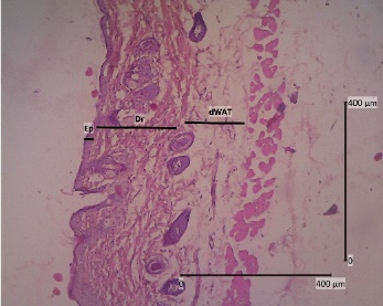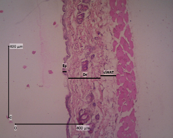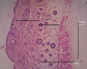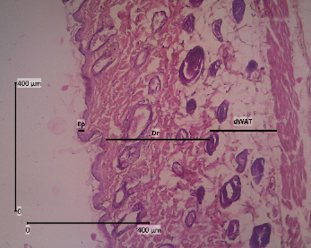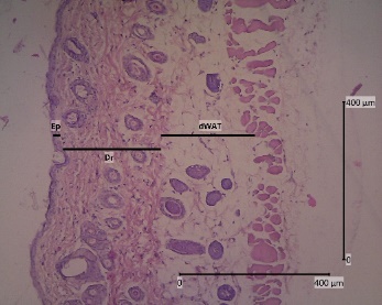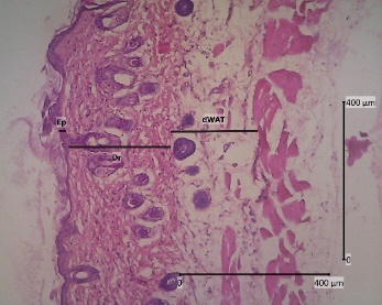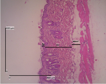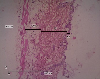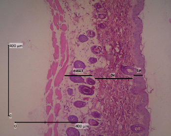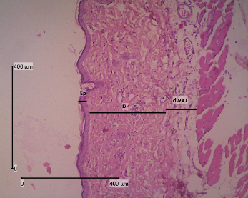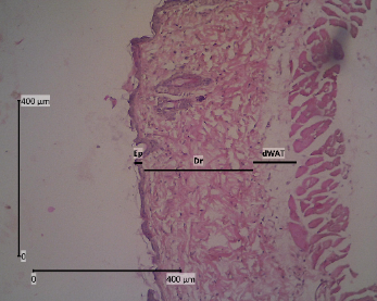 The backs of mice that have been shaved are anesthetized with ketamine 0.04 mg/KgBW and xylazine 0.02 mL/KgBW by injecting liquid in the muscularis. The skin was cut with a thickness of ± 3 mm to reach dWAT (dermal white adipose tissue) and 2 cm long. The animals were sacrificed after skin collection was completed. The skin was then preserved using a 10 % formalin solution and allowed to come to room temperature for ± 48 h [31]. Tissue samples were dehydrated with graded alcohol (70, 80, 90 %, and absolute alcohol) twice for 2 h each. In the clearing stage, the samples were put into xylol 3 times for 1 h each. After that, it was continued with infiltration in paraffin at 60 °C for 3 times for 1 h each. Then the samples were embedded in paraffin and tissue blocks. Using a microtome, tissue blocks that were 5 µm thick were cut and put on a piece of object glass that had been coated with entellan [32].