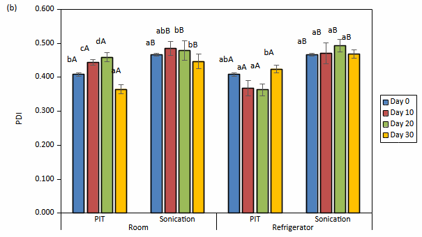 Figure 5 The (a) particle size, (b) PDI, and (c) turbidity of the nanoemulsion stored at room temperature and in the refrigerator for 30 days. Values are means ± standard deviation. The error bars represent the standard deviation. The same lowercase letters are significantly different (p < 0.05) by Tukey's test for storage times. The same uppercase letters are significantly different (p < 0.05) in Tukey’s test for storage conditions.