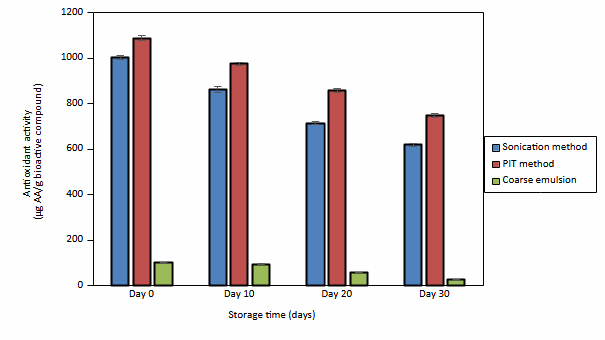 Figure 6 Antioxidant capacity of nanoemulsions prepared by sonication and PIT methods compared to coarse emulsions over 30 days. Values are means ± standard deviation. The error bars represent the standard deviation.