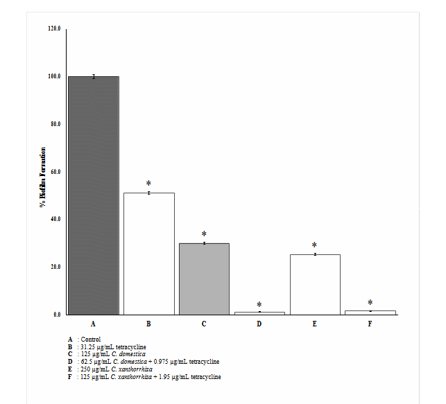 The result of antibiofilm activity in this study revealed a concentration-dependent reduction in biofilm formation. The combination of extract with tetracycline had the better activity compared with single dose of them. Percentage of biofilm formation in combination C. domestica (62.5 µg/mL) and tetracycline (0.975 µg/mL) was only 1.3 and 1.7 % when treated with combination C. xanthorrhiza (125 µg/mL) and tetracycline (1.95 µg/mL) (Figure 2).