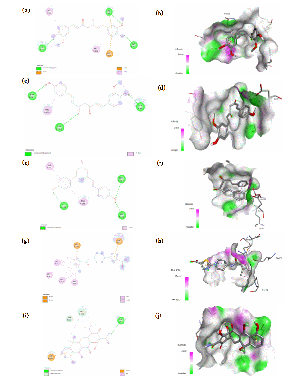 Figure 1 2D and 3D interaction of binding mode with 3TTZ enzyme; (a,b) represent the interaction of Curcumin with 3TTZ enzyme; (c,d) represent the interaction of Demetoxycurcumin with 3TTZ enzyme; (e,f) represent the interaction of Bisdemetoxycurcumin with 3TTZ enzyme; (g,h) represent the interaction of 2-[(3S,4R)-4-{[(3,4-dichloro-5-methyl-1H-pyrrol-2-yl)carbonyl]amino}-3-fluoropiperidin-1-yl]-1,3-thiazole-5-carboxylic acid (native ligand) with 3TTZ enzyme; (i,j) represent the interaction of Tetracycline with 3TTZ enzyme.
