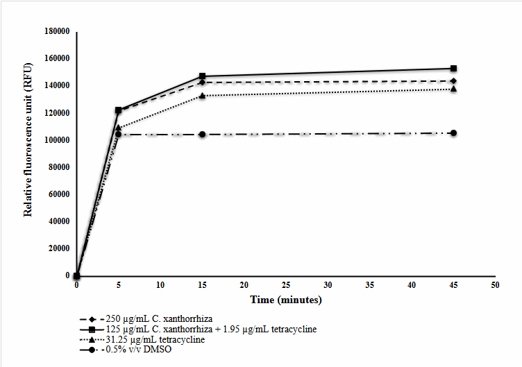 Figure 6 Effect of combined C. xanthorrhiza extract with tetracycline in accumulation EtBr Methicillin-resistant Staphylococcus aureus.