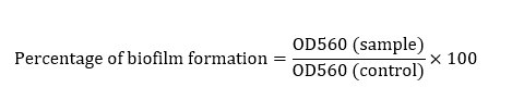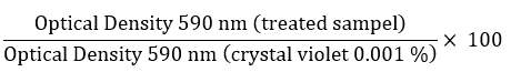 The anti-biofilm formation activity was evaluated by quantitative crystal violet staining assay with slight modification [19]. Briefly, 100 μL of fresh inoculated MRSA in BHI broth (final concentration 1×106 CFU/mL) was aliquoted into each well in presence of MIC concentration of extract and tetracycline, also in concentration on synergistic combination. DMSO 0.5 % (v/v) was using as control. The microplate was incubated for a full day at 37 °C to initiate the process of biofilm formation. After incubation, the supernatant was removed, and the microplate was rinsed thoroughly with PBS (pH 7.3) and air-dried. To stain the formed biofilm, a 0.3 % aqueous solution of crystal violet was added, followed by incubation at 37 °C for 30 min. Thereafter, mix solution in microplate were removed and washed 3 times using PBS pH 7.3. Finally, as much as 200 μL of ethanol 96 % were added to solubilize the dye bound in every cell in microplate and incubated for 15 min in room temperature. The optical density at wavelength of 560 nm (OD560) was measured using Microplate reader (Thermo Scientific/Multiskan GO). This following formula conducted was used to calculate the percentage of biofilm formation in samples.