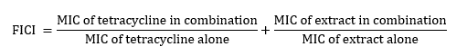 A synergistic interaction between extracts and tetracycline was analyzed using a modest modification of checkerboard broth microdilution method [13]. Two-fold serial dilutions of the plant extracts were carried out along the x-axis, while the y-axis of the microplate allowed for serial dilution of antibiotic. Bacterial suspension was prepared according to the above-described MIC determination method.