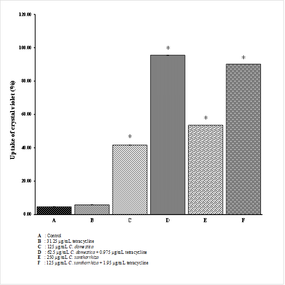 The other bacteriolysis assay present in this study was to calculate the percentage uptake of crystal violet. The percentage uptake of crystal violet from treated sample with a combination of extract and tetracycline also gave higher results than single treated with extract against MRSA. Crystal violet can attach to the bacterial cell membrane. When the bacterial cell membrane was damaged, crystal violet will be concentrated in the supernatant and indicated the high percentage uptake of crystal violet. It’s probable there are any different target site of action from C. domestica and C. xanthorrhiza compared with tetracycline. Secondary metabolite that are contained in these extracts, such as flavonoids, have a mechanism on increasing the permeability of cell membranes. Indirectly, tetracycline can penetrate into cells and eventually become established inside the cell and also occupy the target of action whenever the permeability of the cell membrane is disrupted [35].
