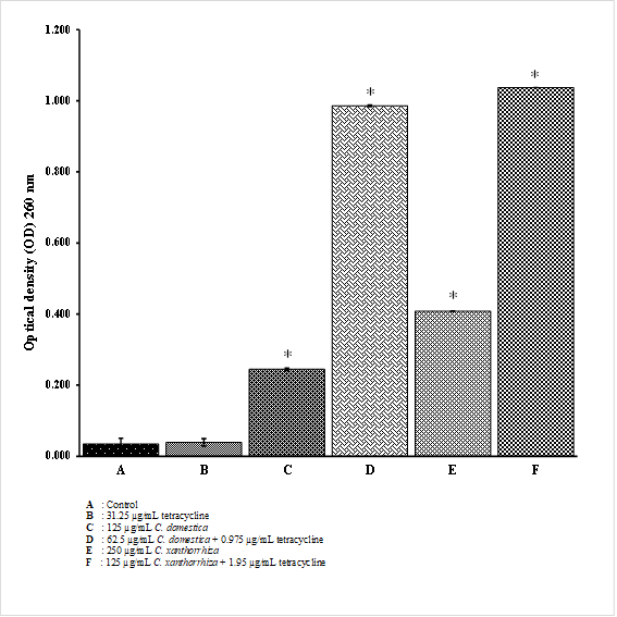 Figure 3 Effect of combined C. domestica and C. xanthorrhiza extract with tetracycline on bacteriolysis activity on Methicillin-resistant Staphylococcus aureus (optical density 260 nm). The sign (*) indicated that the sample was significantly different from the untreated sample (p < 0.05).
