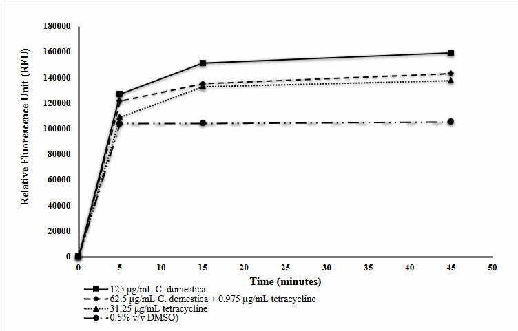 Figure 5 Effect of combined C. domestica extract with tetracycline in accumulation EtBr Methicillin-resistant Staphylococcus aureus.
