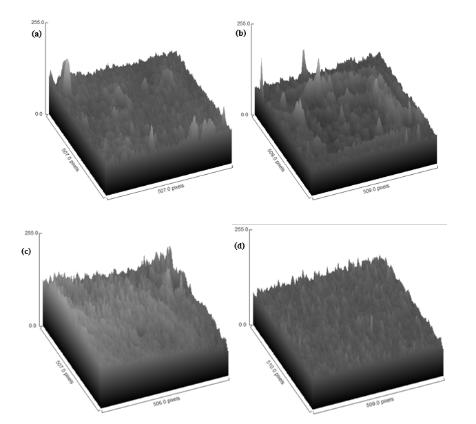 Figure 6 Surface contour of (a) CS-CS, (b) CA-CS/PAA 100, (c) CA-CS/PAA 500 and (d) CA-CS/PAA 1,000 membrane.