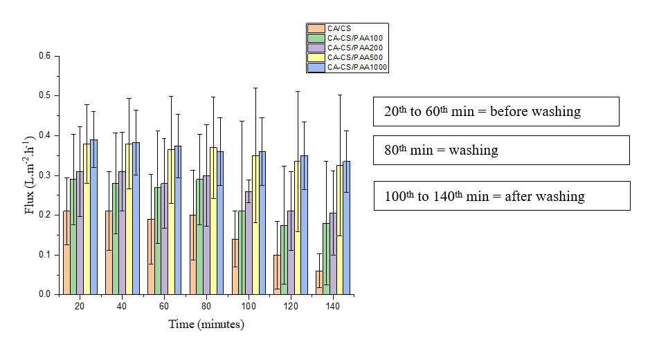 The high performance of the CA-CS/PAA 500 membrane is greatly influenced by its strong antifouling properties. This can be seen in the flux values for each membrane across the 3 filtration phases (before washing, during washing, and after washing), as shown in Figure 11. The flux of the CA-CS/PAA 500 and 1,000 membranes did not decrease significantly after the washing phase, unlike the CA-CS and CA-CS/PAA 100 and 200 membranes, which did. The low flux decrease after the washing phase for both membranes indicates that the fouling on the membrane surface is reversible, or that the likelihood of fouling is very low.