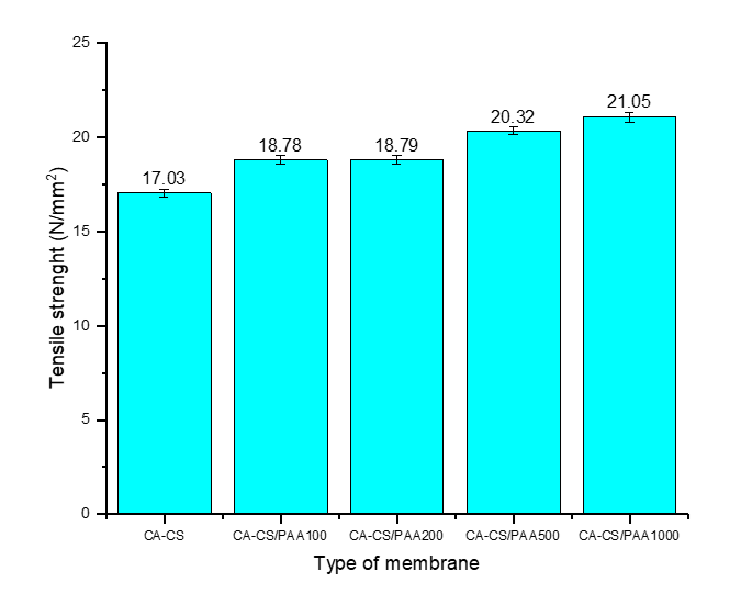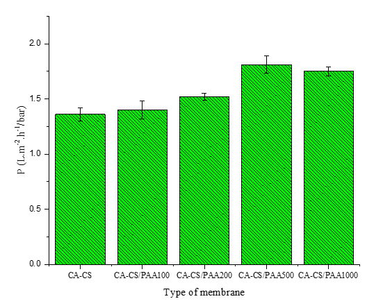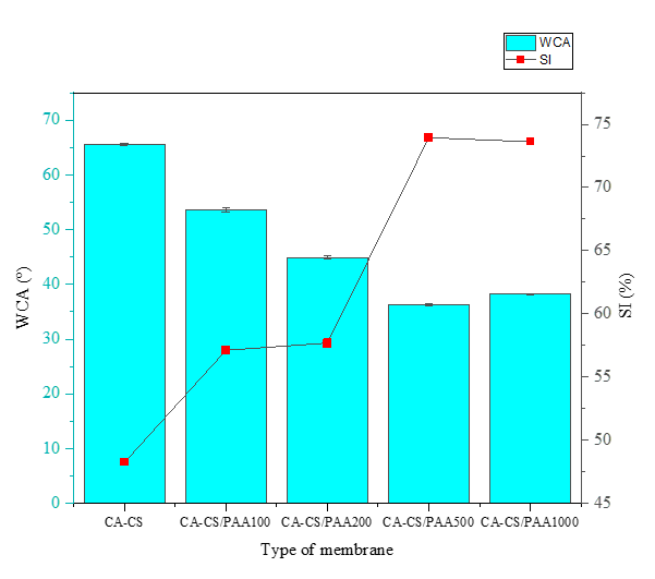 Table 2 summarizes the results of the membrane hydrophilicity analysis, which comprises 3 main parameters: water contact angle, swelling index, and permeability. Water contact angles (WCA) and swelling index (SI) have been used to verify the hydrophilic properties of CA-CS membrane before and after coating. As shown in Figure 7, PAA coating decreases the membrane water contact angle (WCA) from 65.56° (CA-CS) to 53.67° (100 ppm) and 44.87° (200 ppm), reaching a minimum of 36.34° at 500 ppm. At 1,000 ppm, the WCA increases slightly to 38.21°, yet remains far below the baseline CA-CS value. The pronounced reduction up to 500 ppm indicates enhanced surface hydrophilicity due to the incorporation of PAA carboxyl/carboxylate (–COOH/–COO⁻) groups, which increase the polar component of the solid surface energy and reduce the solid–liquid interfacial energy [52-54]. This trend is consistent with independent reports on PAA coating/grafting of PES membranes, where the WCA decreased from 50° to 27°, supporting the interpretation that PAA improves water wettability via exposure of hydrated carboxylate groups [44].